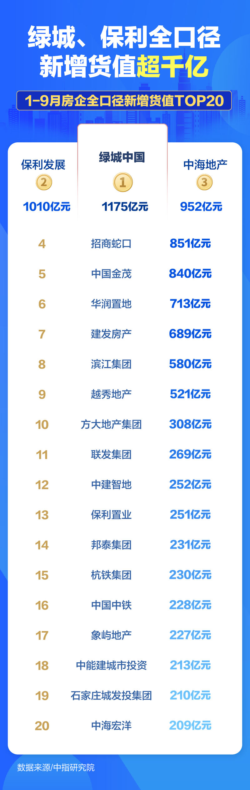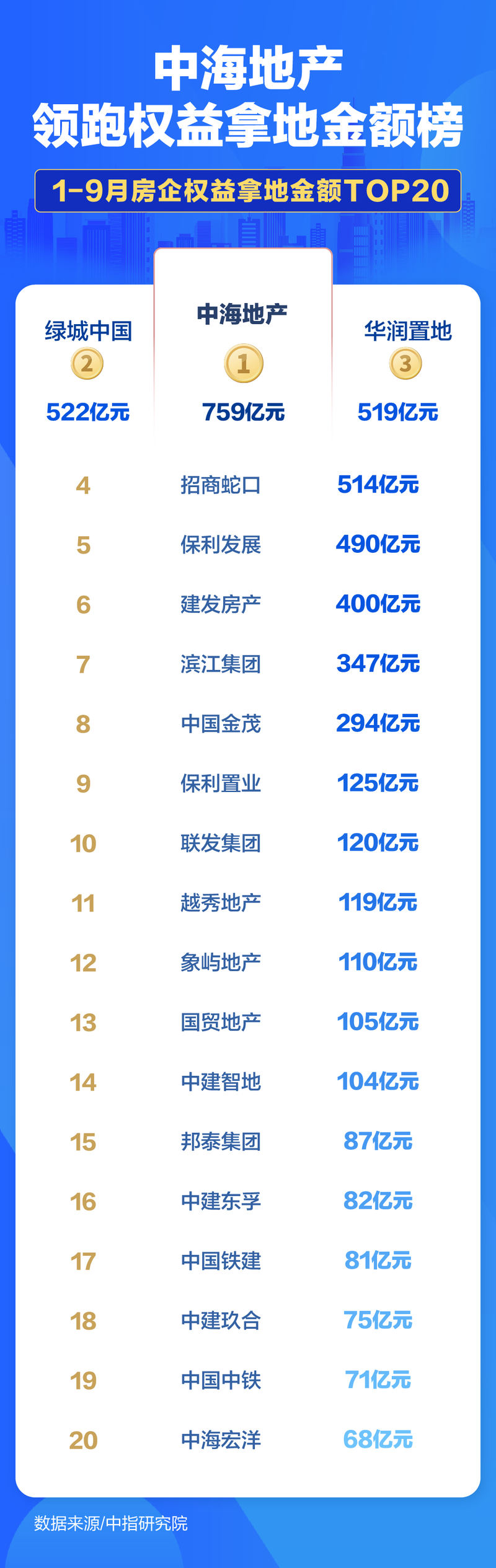 头部房企的拿地力度持续加强。从新增货值来看,1-9月,绿城中国(简称“绿城”)、保利发展(600048)(简称“保利”)和中海地产位列前三,分别为1175亿元、1010亿元和952亿元。而从权益拿地金额来看,中海地产、绿城、华润置地位列前三。