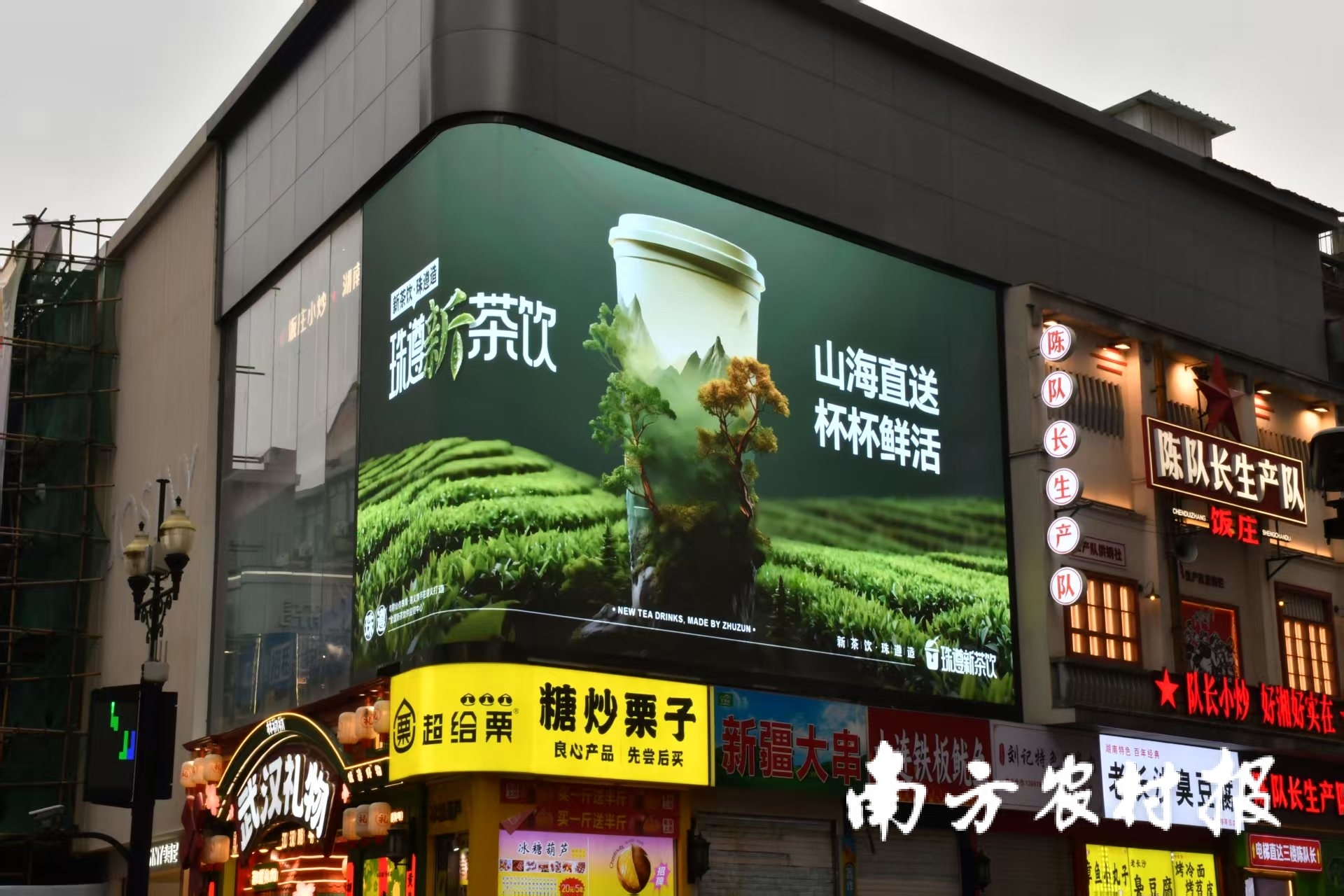 山海直送,杯杯鲜活。杭州西子湖畔的湖滨银泰、南京夫子庙黄金地段的茂业天地、武汉江汉路百年步行街的烟火巷、重庆解放碑的商业地标重百大楼为珠遵新茶饮点亮大屏,画面中茶园、山峦与新茶饮实现创意融合,生动诠释了珠遵新茶饮从“一片叶子”到“一杯茶”的鲜活生命力。与此同时,“珠遵新茶饮”主题巴士穿梭于杭州的大街小巷,巴士外观以清新的茶绿色为主色调,搭配珠遵茶饮的标志性元素,成为杭城一道移动的茶饮文化风景线。