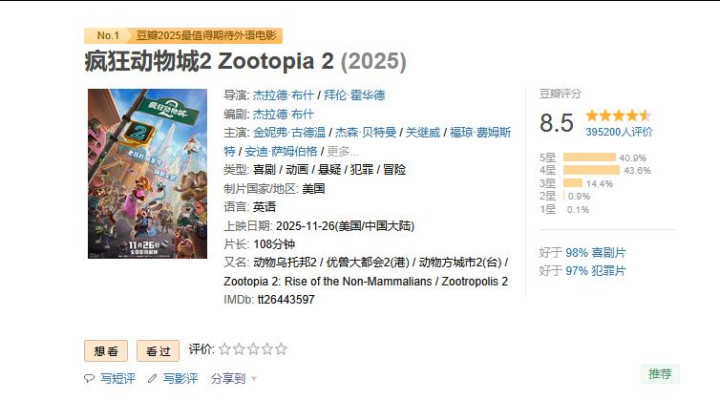 《疯狂动物城2》给出了答案:故事不算新鲜,却凭细腻的人物塑造拿下豆瓣8.5分,截至12月5日票房23.57亿。