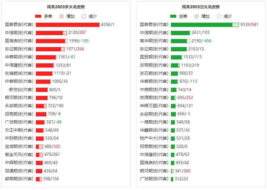 总体而言,纯苯2603合约今日增仓上行,多空持仓排名前20席中,多空双方均呈进场态势,多头进场意愿弱于空头。