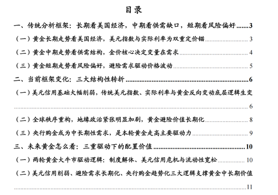 一、黄金的传统分析框架:长期看美国经济,中期看供需缺口,短期看风险偏好。长期来看,黄金价格受美国经济强弱主导,由美元指数与美债实际利率双重锚定,分别反映美国经济的相对强弱与绝对强弱,与黄金价格呈现负相关关系。中期来看,黄金走势看供需结构,因其供给长期具有刚性,难以快速对价格信号作出响应,而需求的波动幅度相对更大,因此黄金的真正定价变量在需求,其中投资需求与央行购金合计占增量需求超50%。短期来看,黄金走势看风险偏好,对应避险属性,其凭借非主权信用特点、抗通胀特性、高流动性,成为应对主权债务危机、地缘冲突、货币超发和金融风险时的核心避险资产。这一框架解释了以往黄金价格的大部分波动,但2024年以来金价与美元、实际利率的同向异动,标志着传统黄金定价逻辑正在发生转变或在失效。