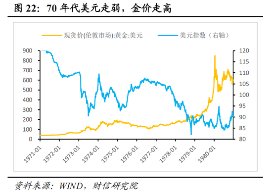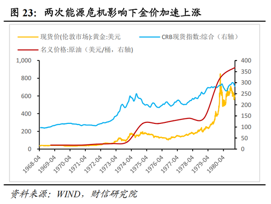 一是20世纪70-80年代,黄金价格经历了长达十年的超级大牛市,期间最大涨幅达2346%。此轮牛市背后有以下三大核心因素共同发力:其一,布雷顿森林体系解体与黄金定价自由化。布雷顿森林体系解体前,黄金价格长期被固定在35美元/盎司,这种固定价格机制使得黄金价不能自由地反映其真实价值。解体后,官方金价虽然在名义上被调整至38美元(1972年)和42.22美元(1973年),但仍有所低估,市场机制开始推升金价走高以反映其内在的真实价值。其二,美元指数走弱与实际利率下行。70年代美元指数整体走弱且实际利率震荡下行,为对冲美元贬值风险,投资者纷纷转向黄金,推动黄金价格上升(见图22)。这一过程可分为两个关键阶段:第一阶段(1971年年底-1973年年初)。1971年年底,《史密斯协定》签订,美元对黄金贬值7.89%,同时调整汇率平价,美元指数累计跌幅达-22%。与此同时,美债实际利率也由高点3.34%下降8个百分点至-4.70%。第二阶段(1976年-1980年)。1976年年初,牙买加体系建立,美元失去了黄金这一坚实后盾,其国际信用地位下降,美元指数从1976年8月的阶段高点106.7快速下跌至84.2,累计跌幅达-21%。同一时期,美债实际利率也由2.25%下降6个百分点至-4.21%。其三,能源危机与通胀压力。70年代两次能源危机冲击使得以石油为代表的大宗商品面临供需失衡格局,能源价格大幅上涨。同时美国在越南战争中的巨额开支以及国内经济问题导致大规模财政赤字,美国乃至全球普遍陷入高通胀甚至“滞胀”困境,这极大提升了黄金作为风险对冲工具的吸引力,推动金价上涨(见图23)。
