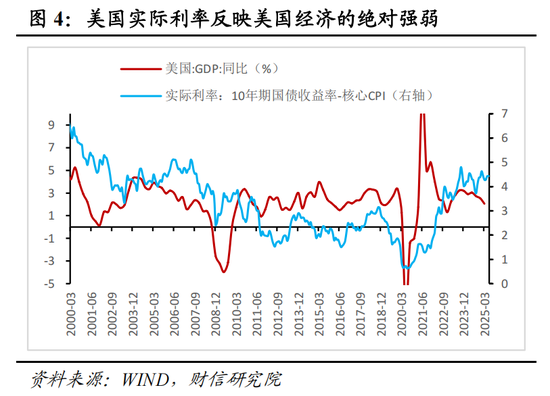 美元、美债实际利率与黄金的负相关关系,背后蕴含着美国经济强弱的传导机制。一方面,美元指数反映美国与全球经济的相对强弱(见图3),即当美国经济疲软时,美元相对购买力下降,指数走低,黄金价格随之上升。另一方面,美债实际利率代表资产的实际回报率,其核心源于实体经济的增长,体现美国经济的绝对强弱(见图4)。当美国经济下滑、实际利率降低时,黄金价格则会上涨。因此,美国经济的强弱变化,具化为美元指数与实际利率的相应波动,也成为黄金价格的双重定价锚。