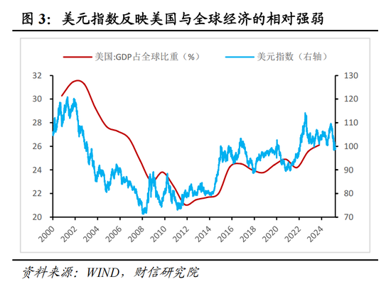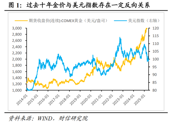 黄金与美元指数长期呈现一定的负相关关系,这是由黄金对美元体系的替代性所决定的,主要基于以下两点逻辑:一方面,美元承担着黄金计价货币的角色。若黄金自身价值保持稳定,当美元相较于其他经济体走弱时,以美元计价的黄金价格则有上升趋势。另一方面,黄金具备价值储藏和交换媒介等货币的基本功能。一旦美元走弱,黄金作为价值储藏手段的地位就会凸显,进而导致黄金需求上升,推动金价上涨(见图1)。