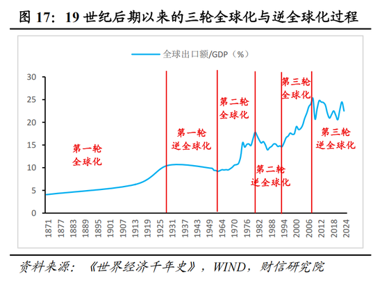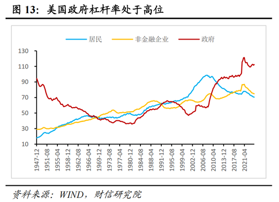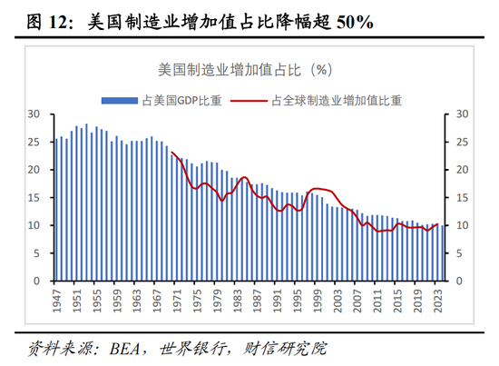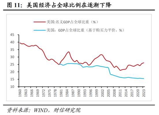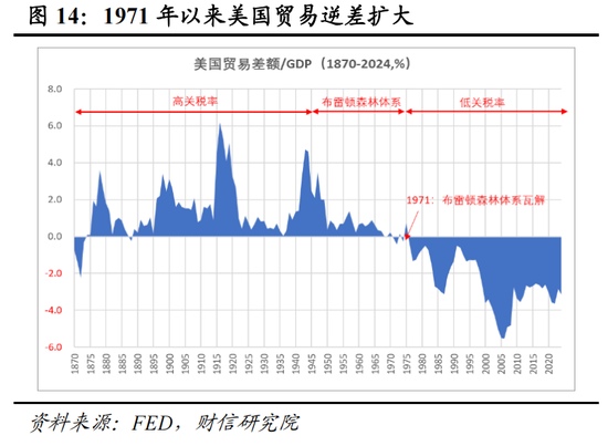 一是美国国力和地位相对优势下降。19世纪末尤其是二战以来,美国在全球的地位和作用经历了几大显著的转折变化:其一,美国经济占全球比例在逐渐下降,其GDP在全球中占比(基于购买力平价)从1890年的10%左右跃升至二战后初期的超30%,再到近10年来的15%左右;名义GDP全球占比从1960年的约40%降至2020年以来的25%左右(见图11)。其二,美国制造业空心化问题日益突出。在经历了从制造业崛起到制造业第一大国后,美国制造业空心化问题逐渐加剧,其制造业增加值占国内GDP比重和占全球制造业比重均由高点的25%左右降至了10%左右(见图12)。其三,美国债务可持续性担忧加剧。2020年疫后美国政府通过7万亿财政刺激维持经济韧性,导致财政赤字由疫前4.6%上升至6.6%,政府杠杆率居高不下(见图13);美国国债规模突破36万亿美元,占GDP比重超过120%,利息支出超国防预算占财政收入比重达13.1%。其四,美国面临着“美元霸权-贸易平衡-制造业大国”的“不可能三角”,其国内问题短期内难以解决。二战后,美国通过布雷顿森林体系确立美元霸权,形成了“美元流出——商品输入”的闭环循环。然而这一模式面临“特里芬难题”而陷入困境,美元作为国际储备货币,需同时满足全球流动性需求(通过美国贸易逆差)与维持美元与黄金固定兑换的信任基础之间的不可调和冲突,最终因美国黄金储备枯竭而崩溃,1971年布雷顿森林体系解体。此后,美国贸易逆差持续扩大(见图14),债务加重,制造业空心化,陷入了“商品输入——美元流出——债务积累”的恶性循环,最终将美国推向“美元霸权——贸易平衡——制造业大国”的“不可能三角”困境,该困境意味着解决贸易逆差和制造业空心化,并保持美元霸权地位不可兼得,美国国内问题短期内难以得到有效解决。其五,短期特朗普政策冲击加剧信用根基动摇。特朗普发动全球关税战缩减贸易逆差,却打破了“商品-美元”循环核心机制,抑制美元全球流通;政策频繁反复和不确定,导致市场预期紊乱,正系统性瓦解美元信用赖以依存的稳定性根基。