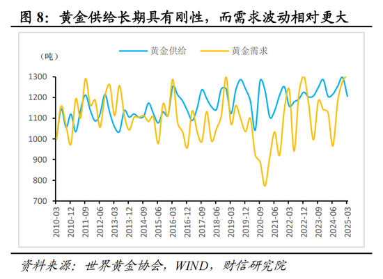 综合来看,黄金的供给在长期具有刚性特征,相比之下,需求的波动幅度相对更大(如图 8 )。由于黄金供给难以快速对价格信号作出响应,所以需求成为了决定黄金价格的核心变量。