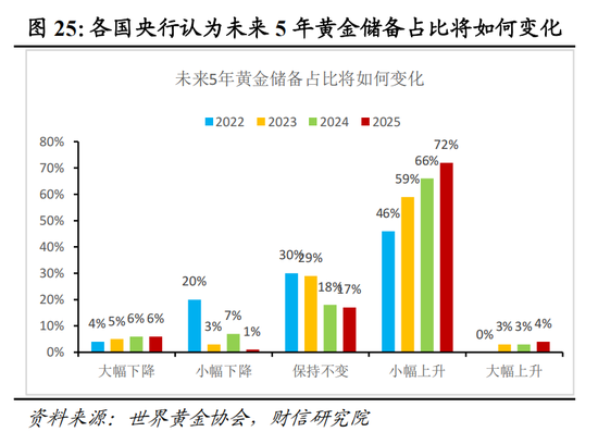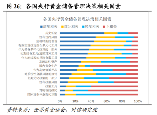三是央行购金将是驱动黄金价格上涨的长期推动力。世界黄金协会《2025年央行黄金储备调查》显示,72%的央行表示未来5年黄金在全球总储备中所占份额将进一步上升(见图25),这一比例创下 2019 年首次调查以来新高,较 2024 年上升 7 个百分点。央行增持黄金,主要因其能降低违约风险、应对危机、抵御地缘政治不确定性、对冲通胀、提供高流动性等,有助于外汇储备多元化,增强风险抵御能力(见图26)。在充满不确定性与动荡局面的当今世界,黄金依然是央行的一项重要战略性资产。