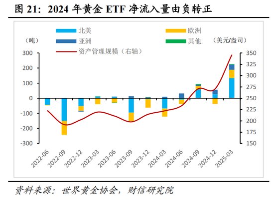 二是投资者也在寻求贵金属行业的投资机会。受地缘政治不确定性加剧、利率走势预期变化以及美元信用体系削弱的影响,2024年黄金ETF净流入由负转正。其中,亚洲国家为主要增持者,2024年全年总计净流入78.4吨,且近年来购金规模持续处于净流出状态的西方投资者重新进入黄金市场,也给金价上涨带来新动力(见图21)。