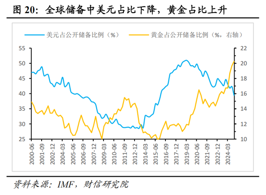 一是央行购金需求或为中长期趋势。虽然布雷顿森林体系解体后世界进入了信用货币时代,黄金逐步退出了流通市场,但是黄金仍是世界各国重要的储备资产。2009年以来,央行在黄金市场由净卖方转向净买方,2022年俄乌冲突后,央行购金增量需求明显提高,连续三年超过1000吨(见图19),“央行购金”对于金价的驱动力显著加强。一方面,美国债务高企、美元信用走弱,支撑央行购金需求。短期而言,无论大规模美债到期续作,还是特朗普新一轮财政预案或将“减税”纳入当中,均将推动美债信用风险抬升;长期看,美债利息占比高企、经济增速放缓导致“美债违约”风险攀升。另一方面,逆全球化背景下,全球央行或将继续增持黄金以提升储备资产的安全性和多元化。根据IMF数据显示,全球外汇储备当中,最近几年美元资产储备份额下降,但黄金资产储备份额呈趋势性上升之势(见图20)。