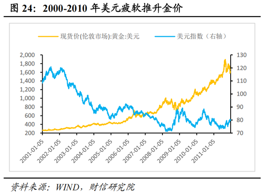 二是在进入21世纪后的第一个十年,黄金再度开启十年大牛市,期间最大涨幅高达668%。此轮推动金价走高主要得益于以下两方面因素:其一,全球流动性宽松与美元走弱。2001-2011年期间,互联网泡沫破裂、次贷危机先后冲击全球经济,促使全球流动性两次转向宽松,美元也随之走弱,为金价上涨注入强大动力(见图24)。具体看,2000年互联网泡沫破裂后,美国于2000年5月启动降息,美债实际利率下降约2.1%,美元指数也由121点下滑至83点,累计降幅达32%;2007年次贷危机爆发并蔓延成全球金融危机,各国政府纷纷开启宽松货币周期,美联储自2007年9月开始连续降息10次,并在2008年开启三轮量化宽松(QE),向市场注入海量流动性,美债实际利率由3.3%的阶段性高点走低至0.6%,美元指数也持续在80点的低位震荡。其二,危机事件驱动金价短期飙升。如2001年“911”恐怖袭击事件引发全球恐慌情绪,VIX指数翻倍上涨,刺激黄金在一周内上涨约8%;2008年9月雷曼兄弟破产后,VIX恐慌指数上涨约3倍,黄金价格最大涨幅高达约16%。