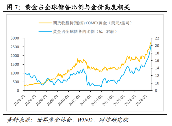 需求方面,珠宝制造和科技需求稳定,但投资需求以及央行储备需求对金价影响显著。黄金需求主要分为四类:珠宝制造、科技、投资和央行储备,占黄金增量需求的比例分别在40%、7%、27%、26%左右。其中,投资和央行购金需求是影响金价的关键因素。投资需求和金价存在一定的正相关性(见图6),投资需求主要包括金条金币和ETF需求,其中ETF需求是导致投资需求波动的关键。央行购金需求也对金价产生一定影响,2007年以来,黄金在全球储备中的占比与金价走势呈高度正相关关系(见图7),是影响金价的关键因素。