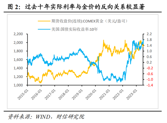 由于黄金是无息资产,不会产生预期现金流,投资者只能通过金价上涨获利,所以持有黄金的机会成本成为影响其投资价值的关键,而美债实际收益率正是这一成本的衡量指标,因此美债实际利率与黄金价格呈负相关关系(见图2),这是2007-2023年金价的核心定价逻辑之一。