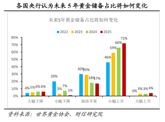 三、未来黄金怎么看:三重驱动下的配置价值。回溯历史,制度解体、美元走弱和流动性宽松是过去两轮黄金大牛市背后的驱动逻辑。第一轮牛市(1970-1980年)源于布雷顿森林体系解体后黄金定价自由化、美元贬值及能源危机引发的全球滞胀;第二轮牛市(2001-2011年)则由互联网泡沫破裂、次贷危机后的流动性宽松导致美元长期贬值驱动,“911”危机事件也驱动短期金价飙升。展望未来,美元信用削弱、避险需求长期化、央行购金趋势化三大逻辑将支撑黄金中长期价值。一是美元“特里芬难题”再现,信用替代深化,黄金非主权属性稀缺性凸显,将对黄金的“超越主权”信用价值形成长期支撑。二是全球秩序重构下,地缘冲突长期存在并日益复杂化,持续提升黄金避险属性。三是央行购金将成为驱动黄金价格上涨的长期驱动力,如世界黄金协会《2025年央行黄金储备调查》数据显示,76%的央行计划未来五年增加黄金储备占比,构成了金价长期上行的坚实基础。