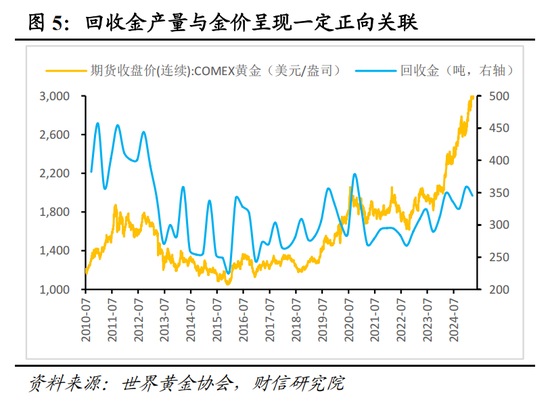 在黄金供给端,其产量较为稳定,矿产金产量主要影响金价长期走势,回收金产量则与金价短期波动息息相关。根据世界黄金协会的划分,黄金供给主要由矿产金、生产商净套保、回收金(黄金产品还原回未加工状态形成的供给)三部分构成。矿产金是黄金供给的核心,由于其生产和开采周期较长,短期内产量相对稳定,但长期会对金价产生一定扰动。回收金则与金价短期波动关系密切,当金价上升时,持有者倾向于抛售存量黄金制品以兑现利润,回收金供给相应增加;而当金价下跌,持有者惜售情绪上升,回收金供给随之收缩(见图5)。生产商净套保的量相比黄金总供给规模很小,对金价影响有限。