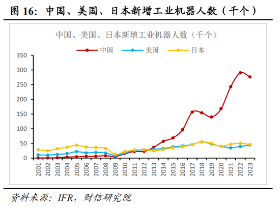 二是美国AI叙事优势面临严峻挑战,科技领先地位受到冲击。自2022年ChatGPT问世以来,AI技术的迅猛发展与广泛应用强化了美国在科技领域的垄断地位,美国科技股开启了长达2年的大牛市行情。但2025年年初,中国的DeepSeek横空出世,重塑了AI大模型的竞争格局,DeepSeek以低成本、高性能以及开源三大超预期优势,成功打破了美国在 AI 技术领域的垄断局面,扭转了美国在这一领域的科技叙事优势。根据LMSYS Chatbot Arena的评分结果,截至今年2月,中美AI模型差距已经明显缩小(见图15)。与此同时,AI革命正逐步向应用端拓展,中国具有市场大、应用场景广阔等优势,为其弯道超车美国提供了可能性。如中国目前拥有全球规模最大的工业机器人应用市场,其市场规模远超美国等发达国家(见图16),这标志着美国在科技上的绝对优势正在逐渐被削弱。