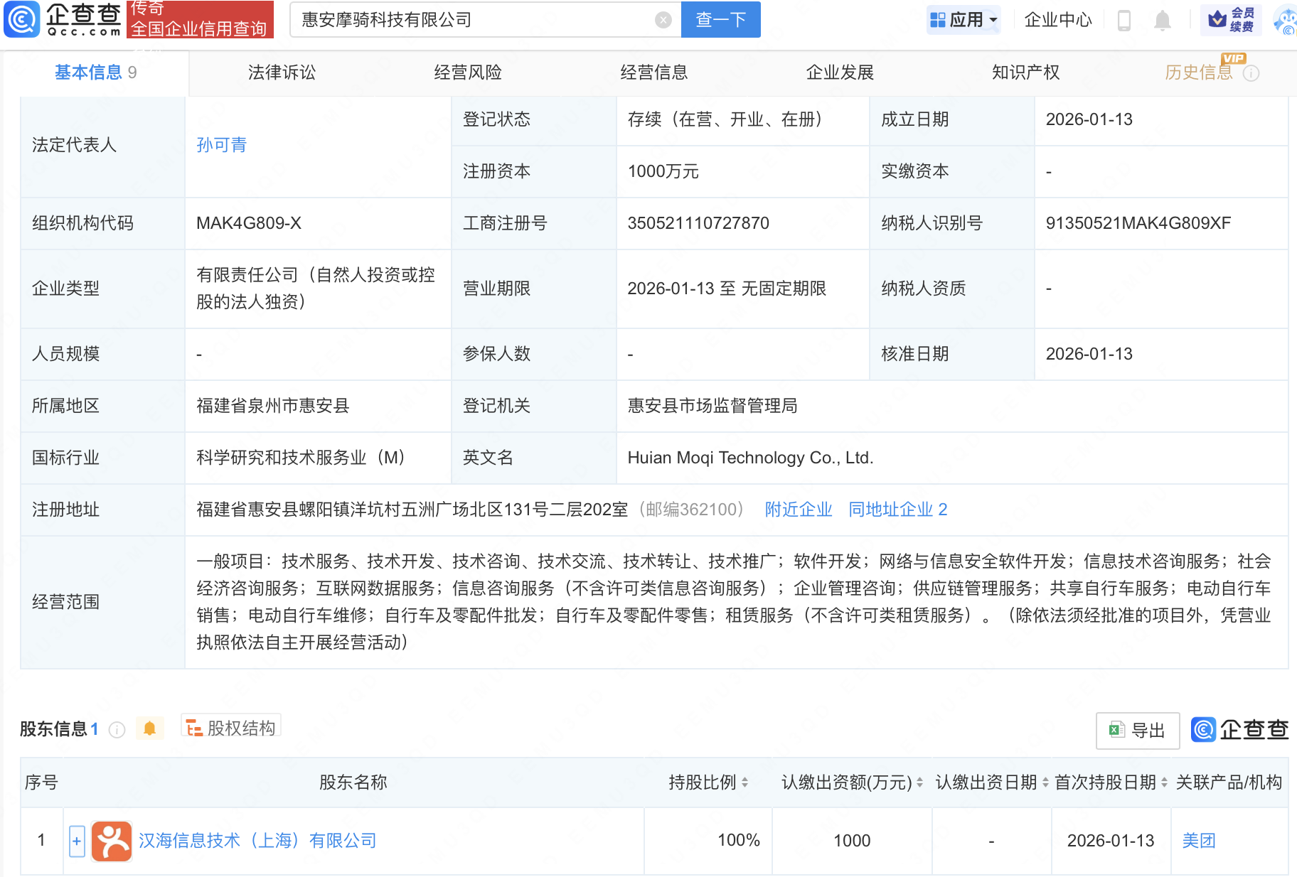 近日,惠安摩骑科技有限公司成立,经营范围包含:网络与信息安全软件开发;信息技术咨询服务;社会经济咨询服务;互联网数据服务等。企查查股权穿透显示,该公司由美团关联公司汉海信息技术(上海)有限公司全资持股。