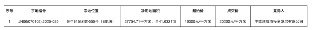 地块信息显示,编号JN05(070102):2025-025地块,位于金牛区金府路555号(E地块),属于西南交大板块,用地性质为住宅用地,总用地面积27754.71平方米(合41.6321亩), 规划建筑面积69386.77平方米,容积率2.5,起始楼面价16300元/平方米,折合起始总价11.31亿元。
