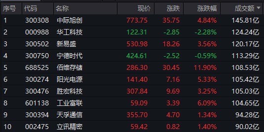 个股方面,中际旭创半日成交额超145亿元居首,华工科技、新易盛、宁德时代成交额靠前。