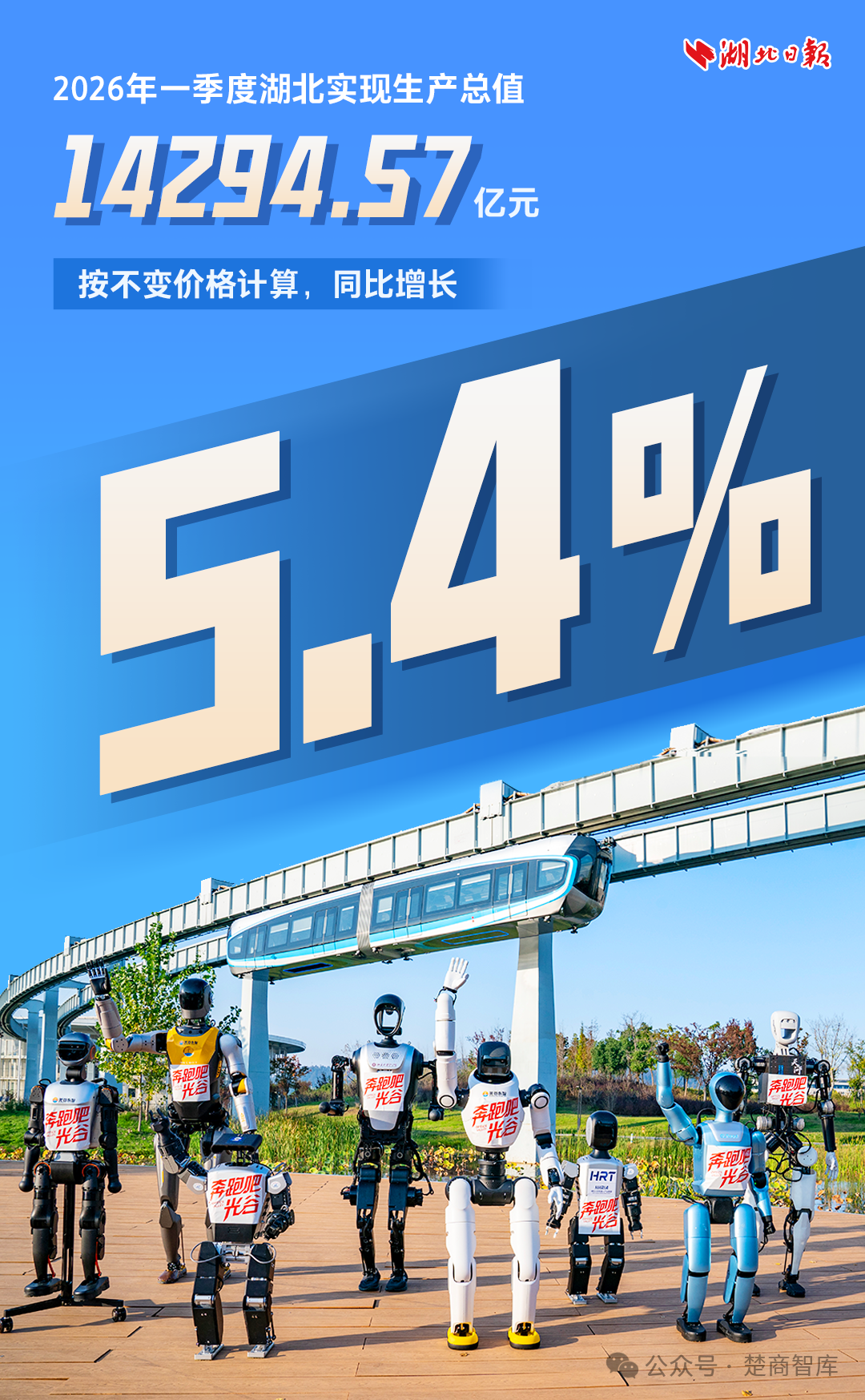4月20日,湖北省统计局、国家统计局湖北调查总队发布2026年一季度湖北经济运行情况。根据地区生产总值统一核算结果,一季度湖北实现生产总值14294.57亿元,按不变价格计算,同比增长5.4%。