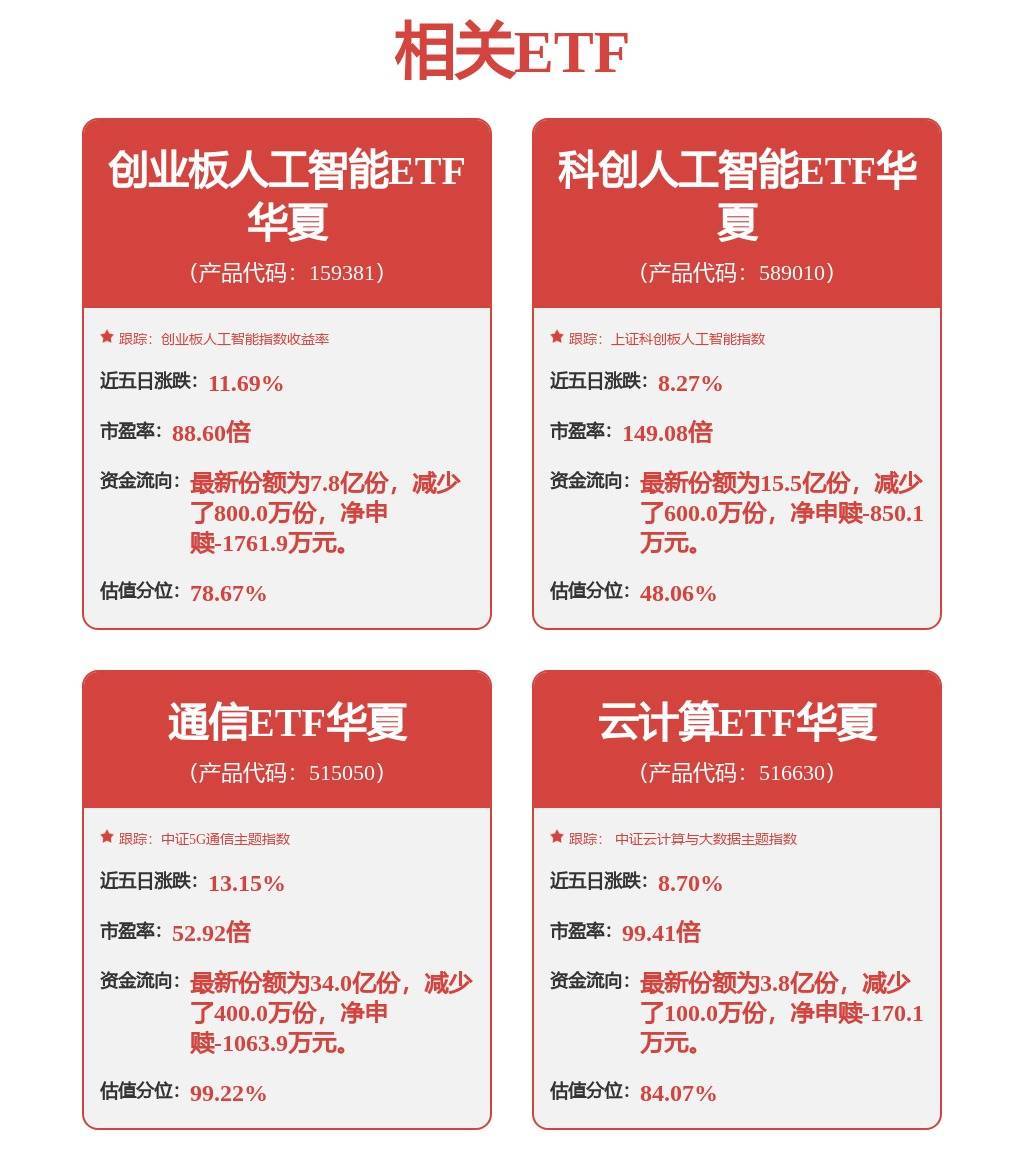 4月14日,算力行情接连爆发,CPO光模块、光芯片、PCB板块再度走高,沪电股份迅速涨停,深南电路、兆易创新、中际旭创等热门股纷纷上涨。截至11:08,同指数规模最大通信ETF华夏(515050)涨幅达3.29%,同类费率最低创业板人工智能ETF华夏(159381)涨幅达4.1%,盘中交易价格均创历史新高。